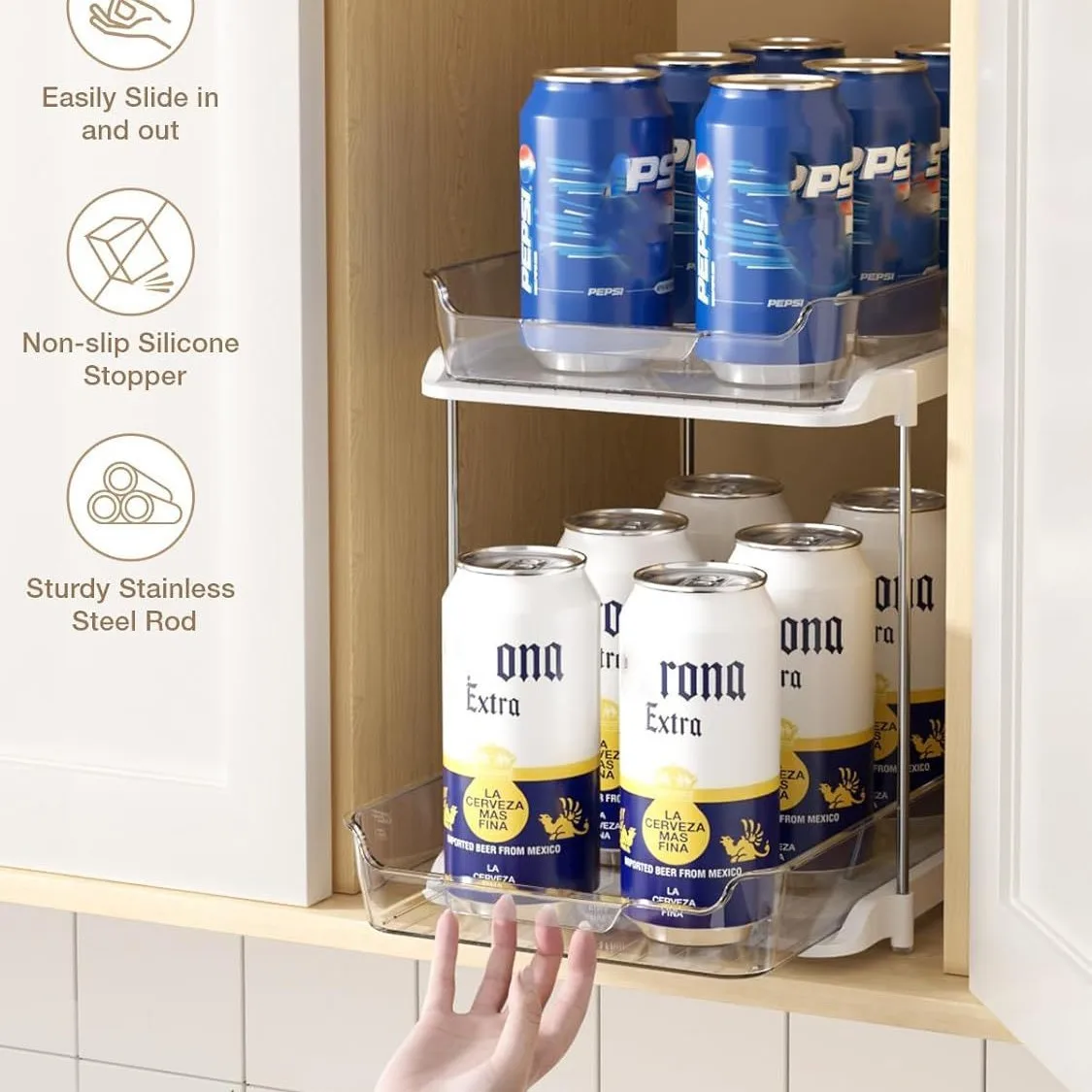 Pull-Out Drawers and Divider: This kitchen cabinet organization set come with 2 slide-out drawers and 4 movable dividers. Each drawer can slide in and out smoothly, making it a breeze to access hard-to-reach things. The movable divider allows you to freely adjust the spacing as you like to organize your meds, cosmetics, stationery, skincare, perfume, brushes, etc.